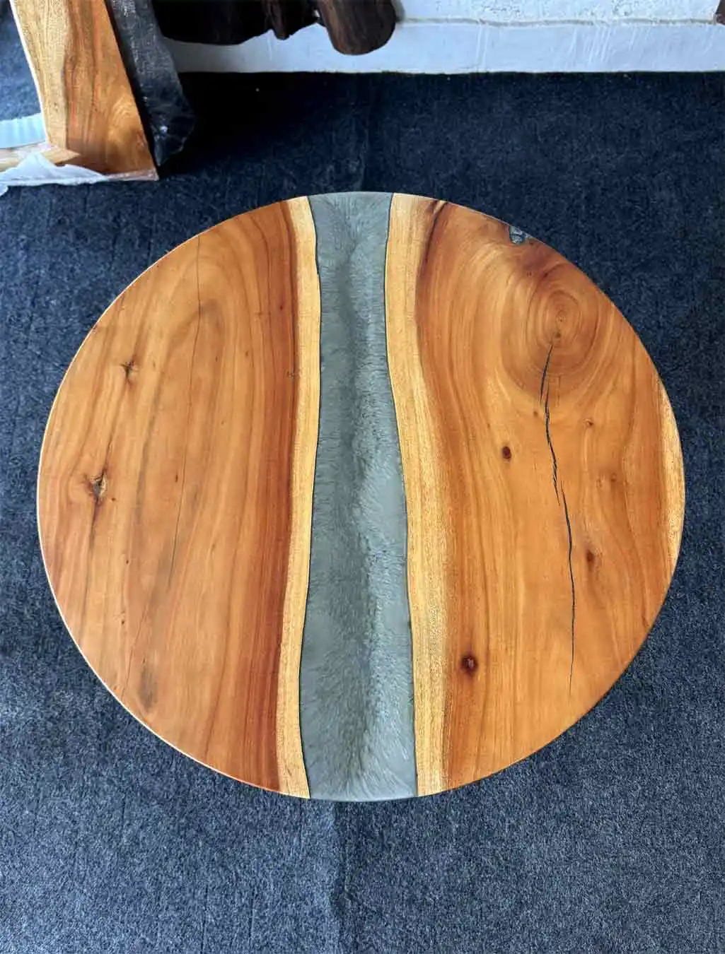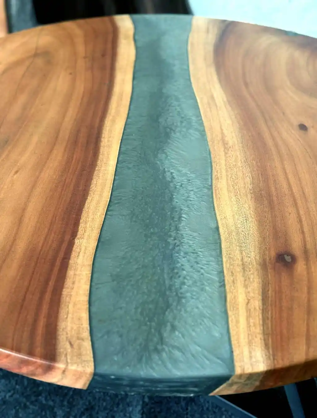 The grey epoxy resin finish gives the table a modern look while highlighting the natural beauty of the wood.