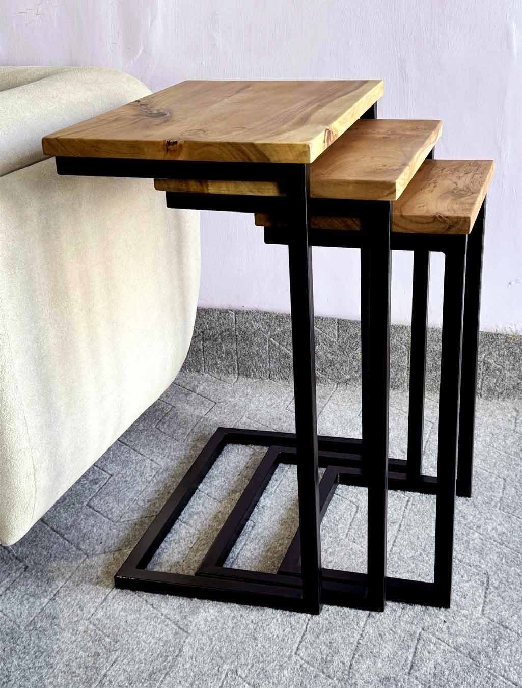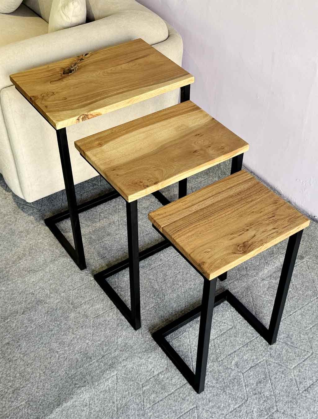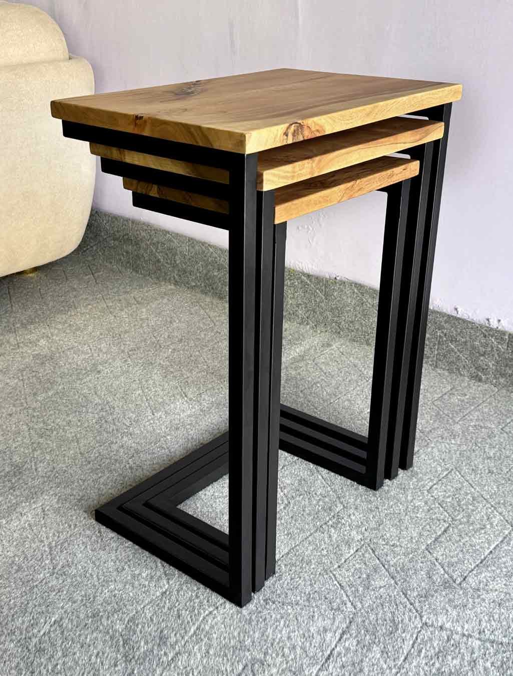 Each nesting table wooden top is made from naturally seasoned solid acacia wood, paired with a strong metal pipe base. The solid structure ensures durability, while the wood grain gives every table a unique natural look.